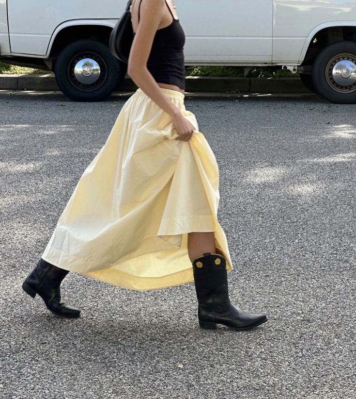 Play with texture! The flowy butter yellow maxi skirt pairs perfectly with classic cowboy boots, creating a look that’s both feminine and a little bit wild—ideal for festivals, concerts, or weekend adventures.