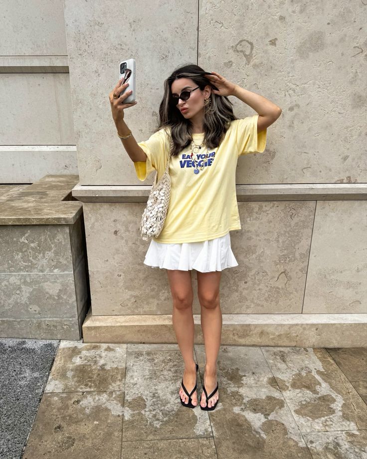 3. Oversized Graphic Tee + White Mini Skirt + Statement Bag